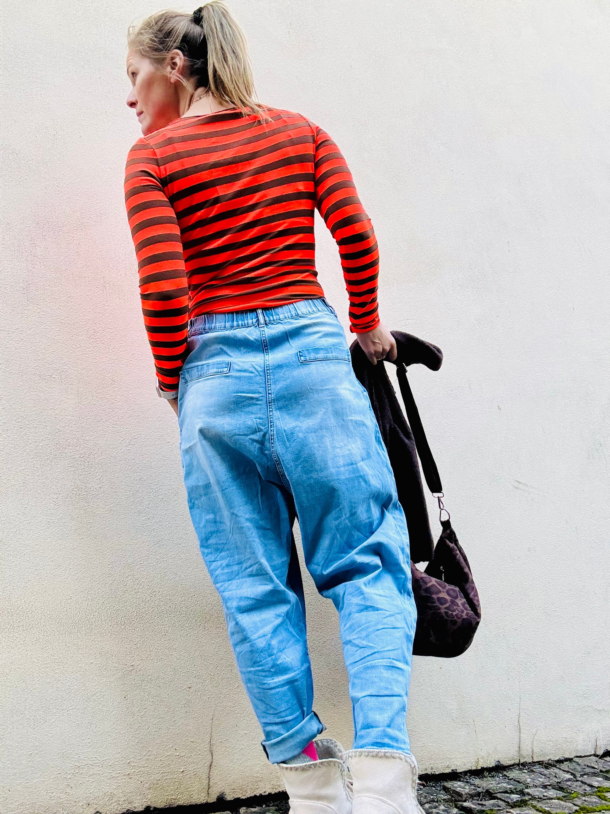 Was ein Schritt - wie tief sitzt er? Er macht so einen coolen Look. Hinten am Bund ist ein Gummizug. Ihr wisst, bequem ist oberste Priorität neben Material (73% Baumwolle, 24,5% Polyester, 1,5% Viskose und 1% Elasthan) und Style.