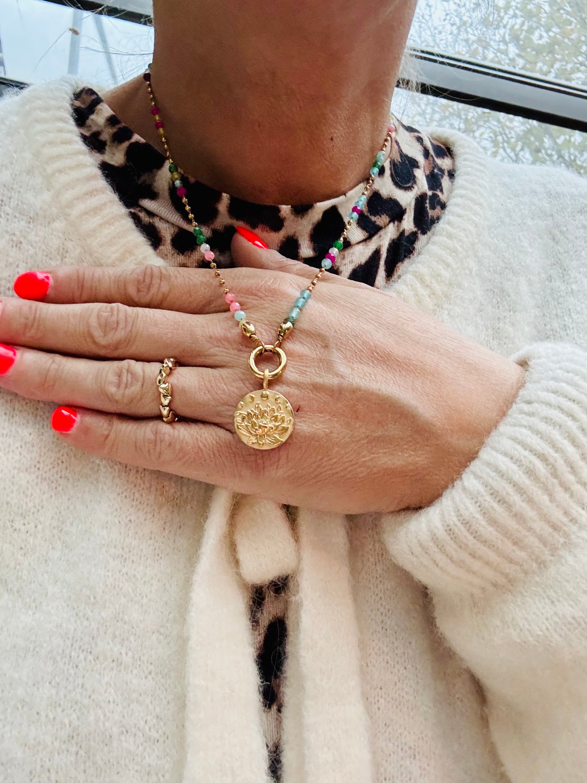 Diese besondere Kette vereint lichtdurchwirkte Edelsteinperlen mit einem bedeutungsvollen Mandala-Anhänger – ein Symbol für Ausgeglichenheit, Vertrauen und den Fluss des Lebens.