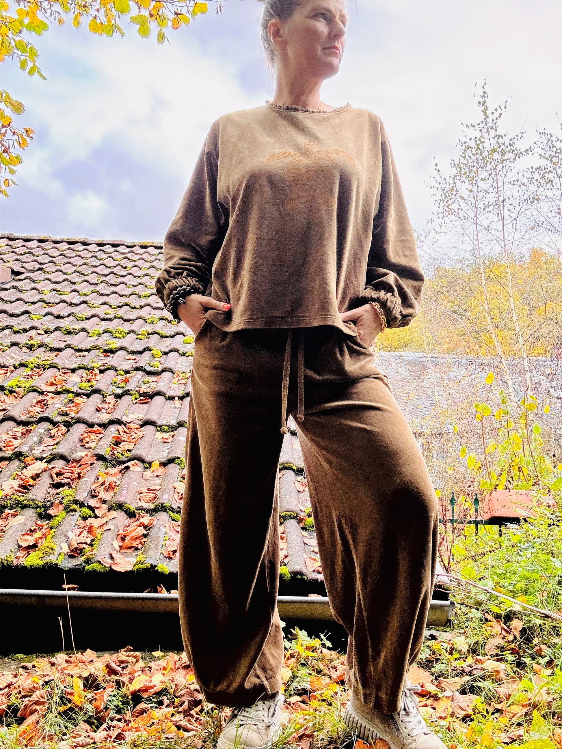 Aktuell in der Farbe Kamel, passende Hose im Shop. Süße Details am Ausschnitt und Ärmelbündchen