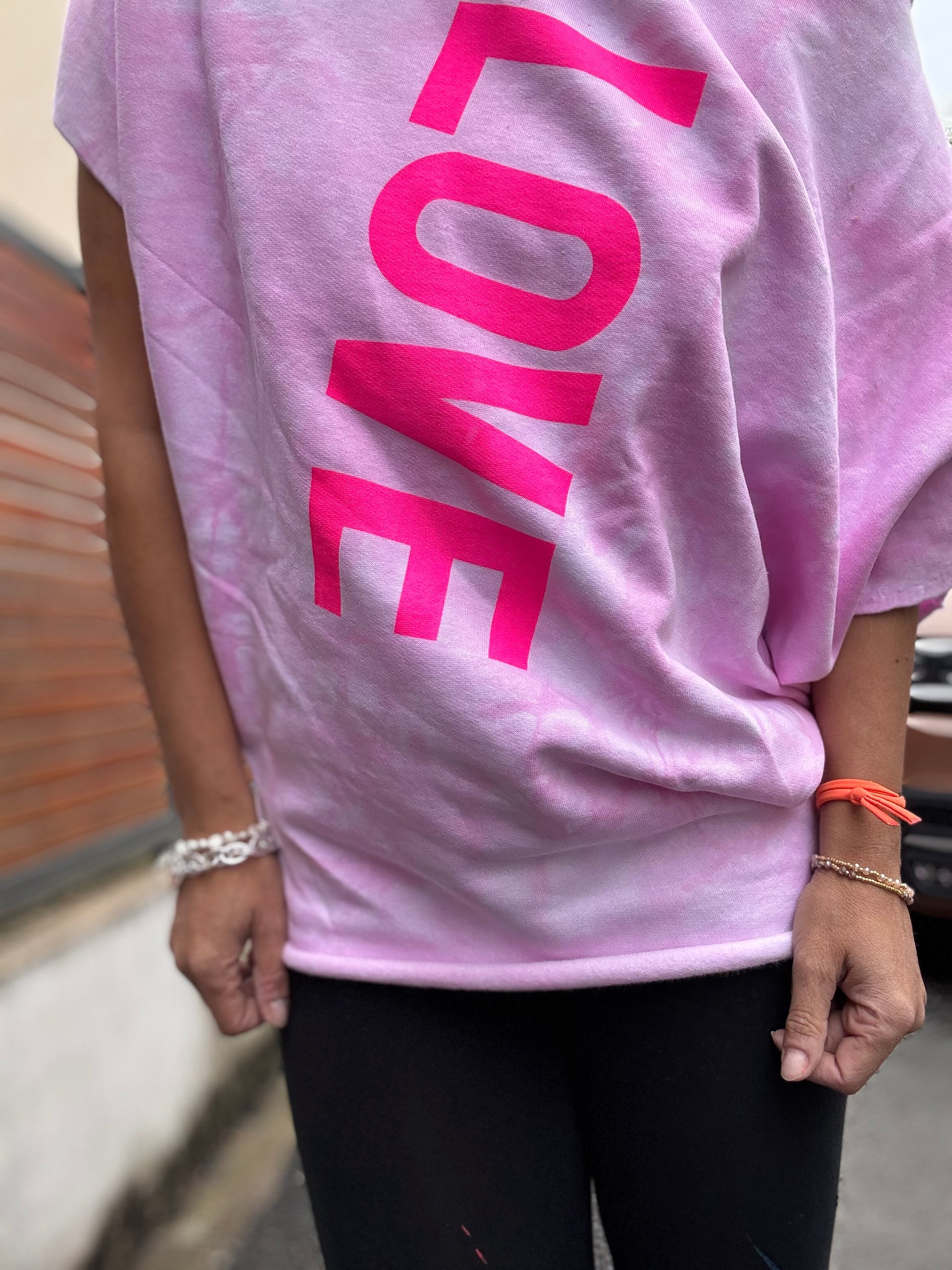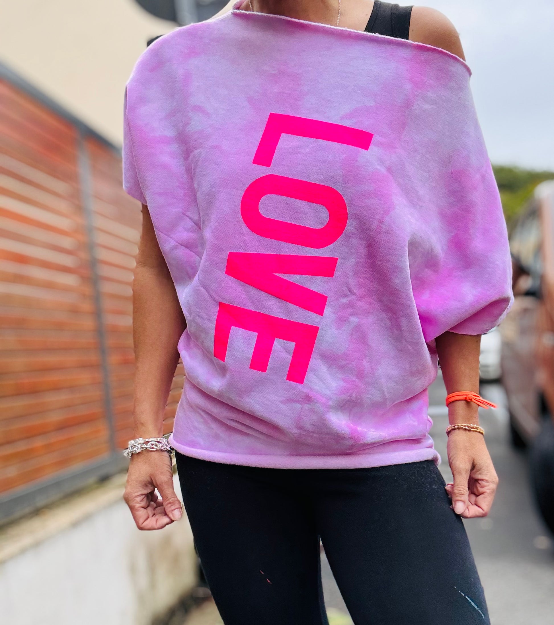 Unsere selbsgenähten LOVE Batik Shirts sind innen ganz weich und warm. Sehen toll über den Cashmere Tops aus oder ohne was drunter.