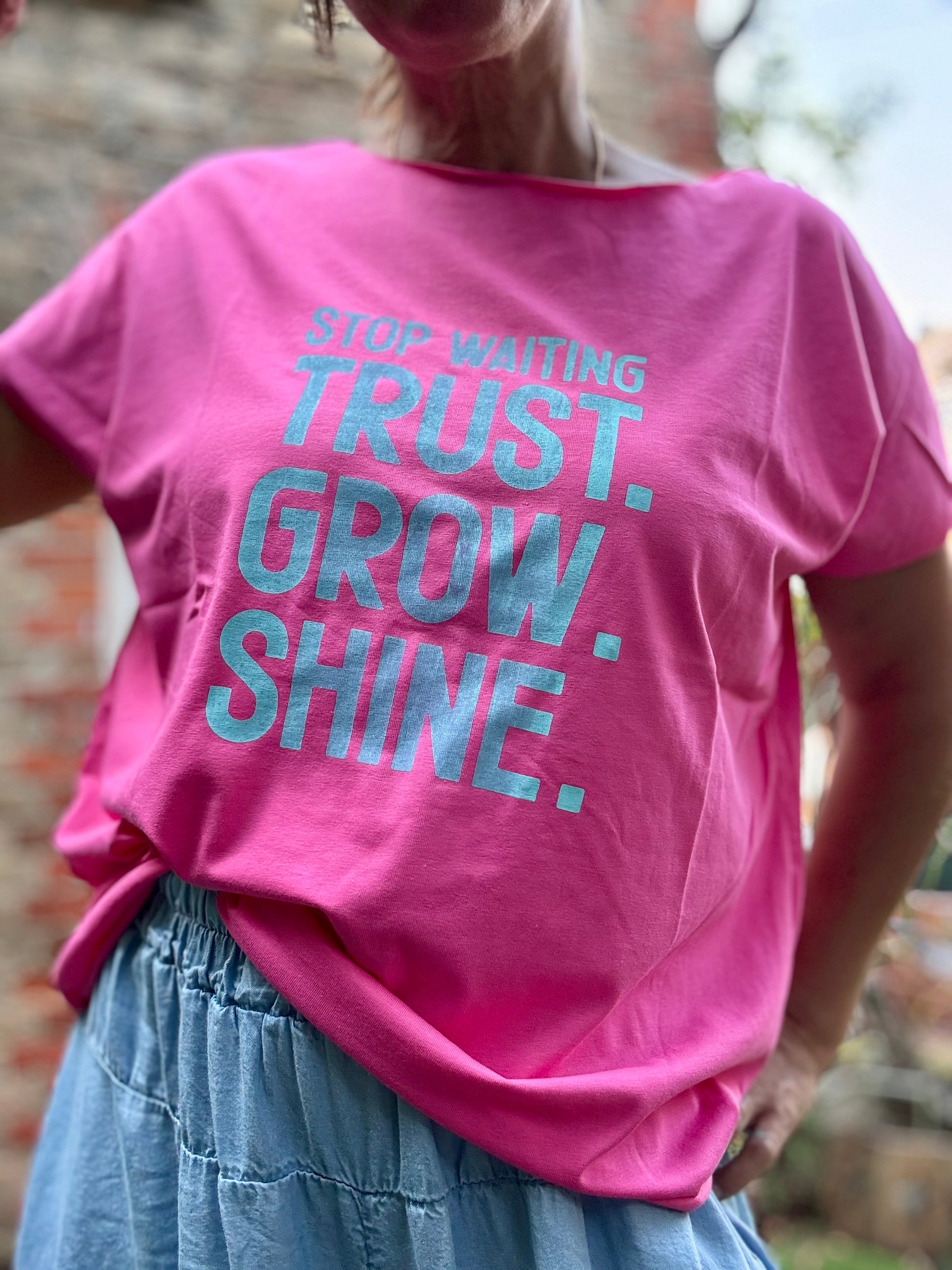 Stop waiting. Trust. Grow. Shine. ist mehr als ein Spruch. Es ist eine Einladung, die Kontrolle zu übernehmen und das Beste aus jedem Moment zu machen. Vertrau dir selbst. Wachse. Und lass deine wahre Stärke erstrahlen.